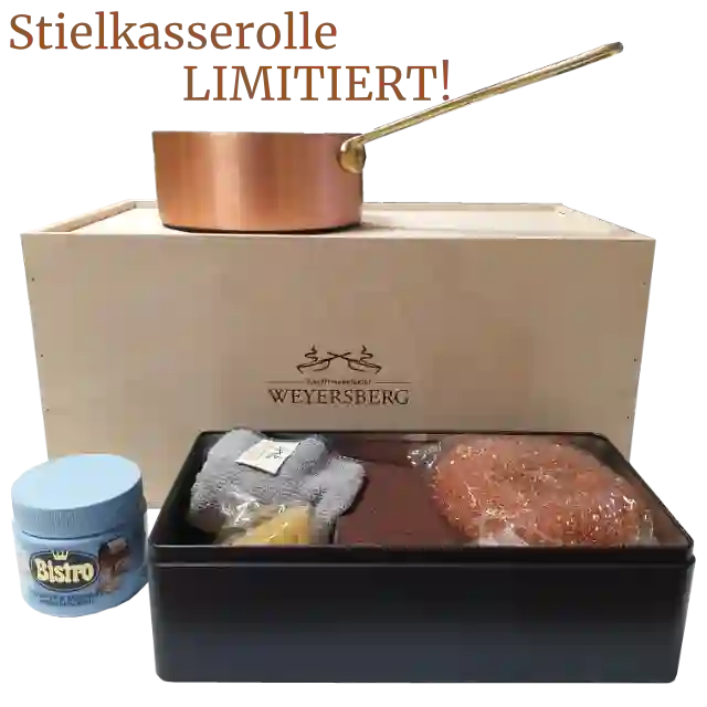 Auf unsere Kupferprodukte gewähren wir 10 Jahre Garantie. Außnahme bildet die Keramik-Induktion-Serie. Auf diese Serie gewähren wir 3 Jahre Garantie.