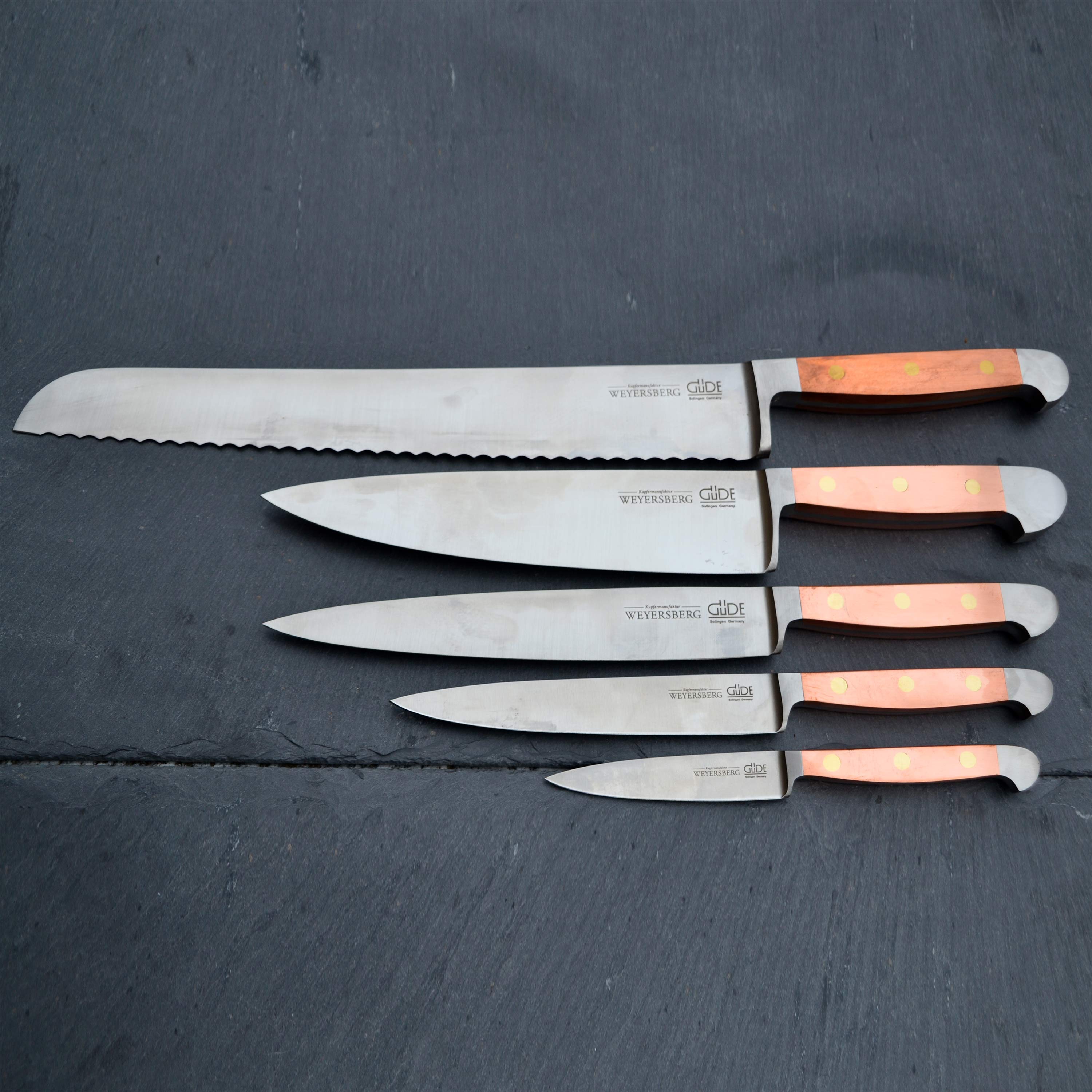 Die Messerserie, die alle klassischen Eigenschaften geschmiedeter Messer mit hoher Alltagstauglichkeit verbindet. Die Klingen sind aus rostfreiem Chrom- Vanadium-Molybdän-Stahl. Der geschmiedete Stahl wird eisgehärtet und handgeschärft. Der Messergriff besteht aus massiven 8 mm starken Griffschalen aus reinem Kupfer, man spürt förmlich die "schwere Qualität".