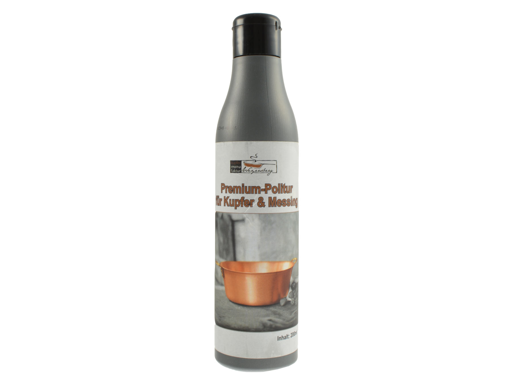 Kupfer & Messing Premium Politur, 200ml. Einreiben, Spülen, Abtrocknen. Die Kupfer- und Messing-Premiumpolitur eignet sich perfekt zur Reinigung von hochglanzpolierten Kupfertöpfen. Zur Reinigung der matten Töpfe / Pfannen empfehlen wir die alternativ erhältliche "Bistro Reinigungscreme".